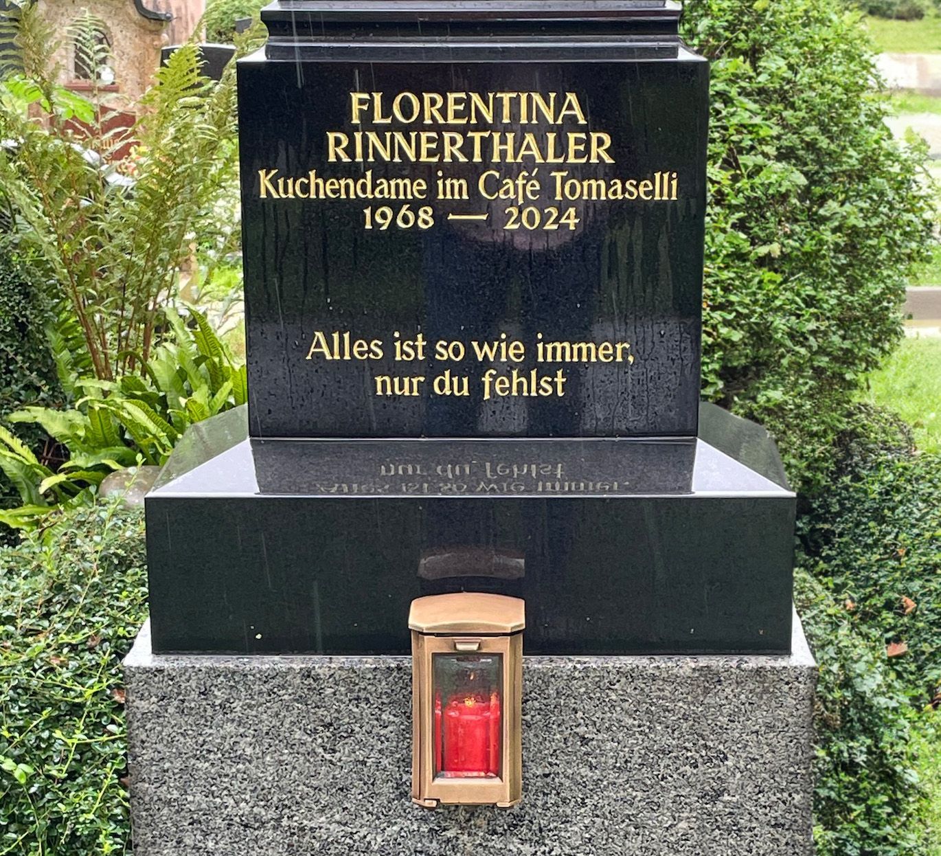 „Kuchendame im Café Tomaselli“. Die Inschrift auf diesem Grabstein wird noch so manchen Friedhofgänger, der zufällig daran vorbeikommt, zum Staunen und zum Schmunzeln bringen. Von Dir, Reinhard, wünsche ich mir in einem Deiner künftigen Bücher eine Geschichte über einen Kuchendamens-Gatten … oder wie auch immer das grammatikalisch richtig heißen mag. Und noch viele Erinnerungen an diesen einzigartigen Menschen Florentina Rinnerthaler.